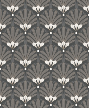 Schwarze Vliestapete mit Vinyloberfläche, metallisch glänzenden Konturen, weißen Details, Art-Deco-Stil.