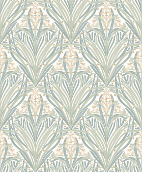 Sanft geprägte cremefarbene Vliestapete mit Vinyloberfläche, beige und grünem Art-Déco-Blumenmuster, halbglänzende Details.