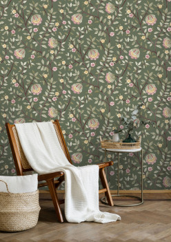 Grüne Vliestapete, Blumenmotive in Grün-, Rosa- und Ockertönen.