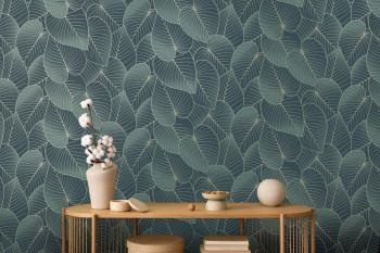 Grüne Vliestapete, goldene Umrisse von Blättern.