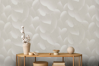 Grau-beige Vliestapete, goldene Umrisse von Blättern.