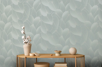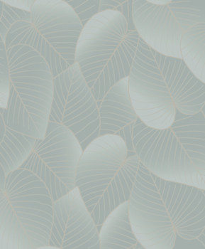 Graugrüne Vliestapete, goldene Umrisse von Blättern.