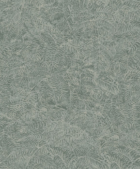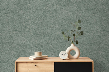 Abwaschbare Vliestapete mit Vinyloberfläche, Blatt- und Zweigmotiven, in Grautönen und halbglänzendem Silber.