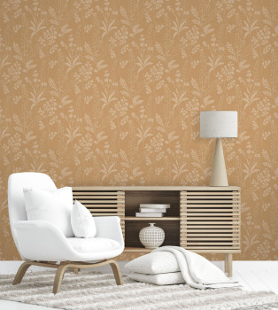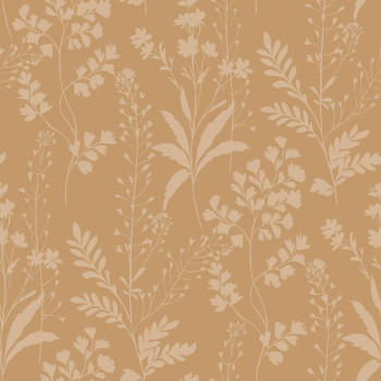 Fein strukturierte braune Vliestapete, glatte Blätter und Blumen in Metallic-Beige.