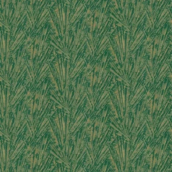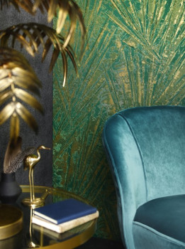 Luxuriöse Vliestapete - Umrisse von goldenen Palmenblättern auf grünem Hintergrund.