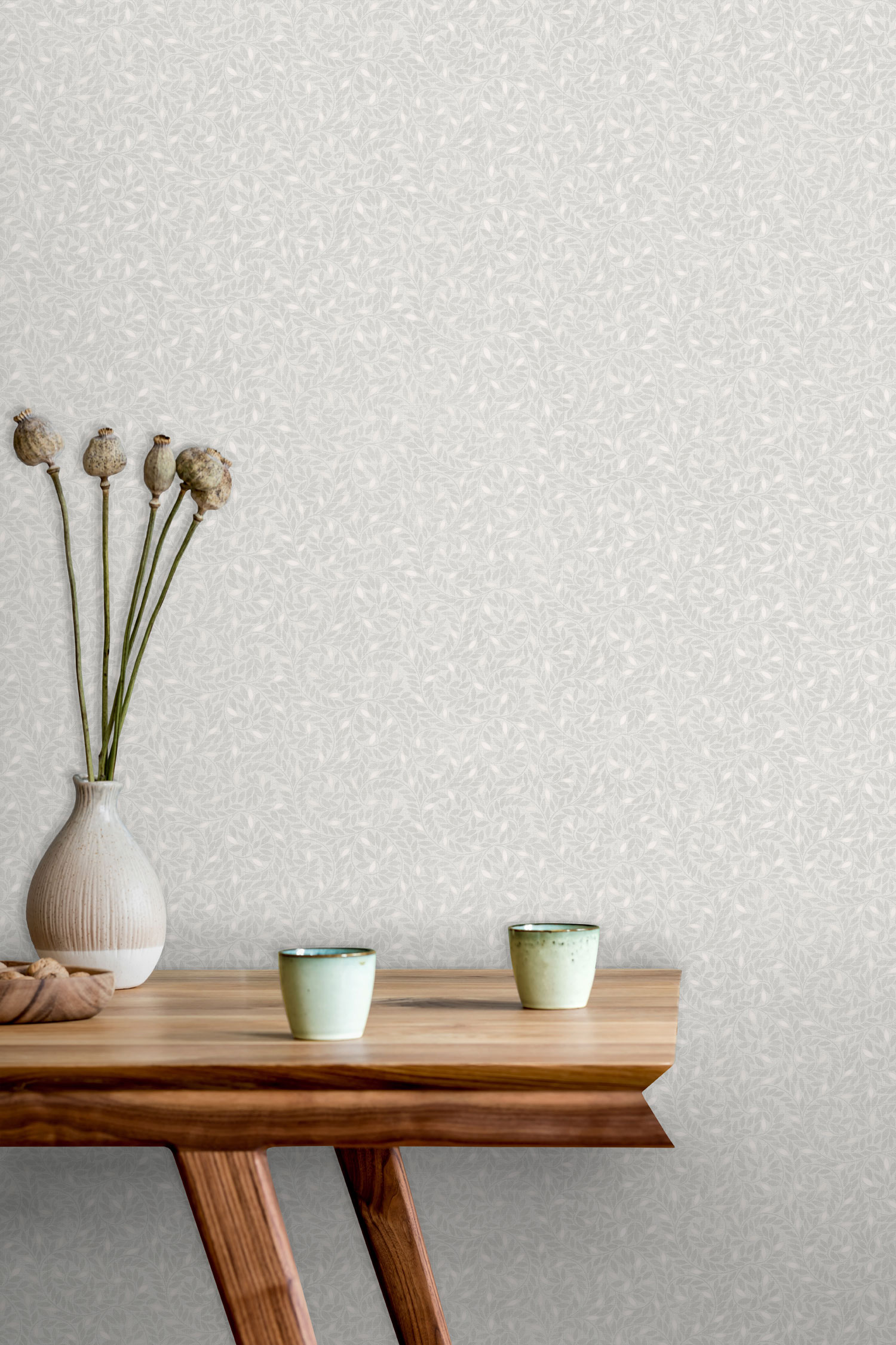 Fein strukturierte grau-weiße Vliestapete - Zweigmotive, halbglänzende Details.