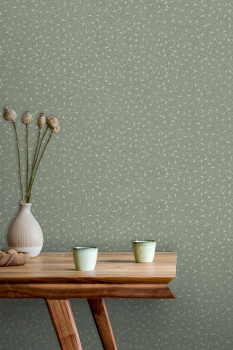 Fein strukturierte grüne Vliestapete - Zweigmotive, halbglänzende goldeneDetails.