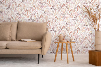 Weiße Vliestapete, Blättermotive in Rosa-, Braun- und Lilatönen.
