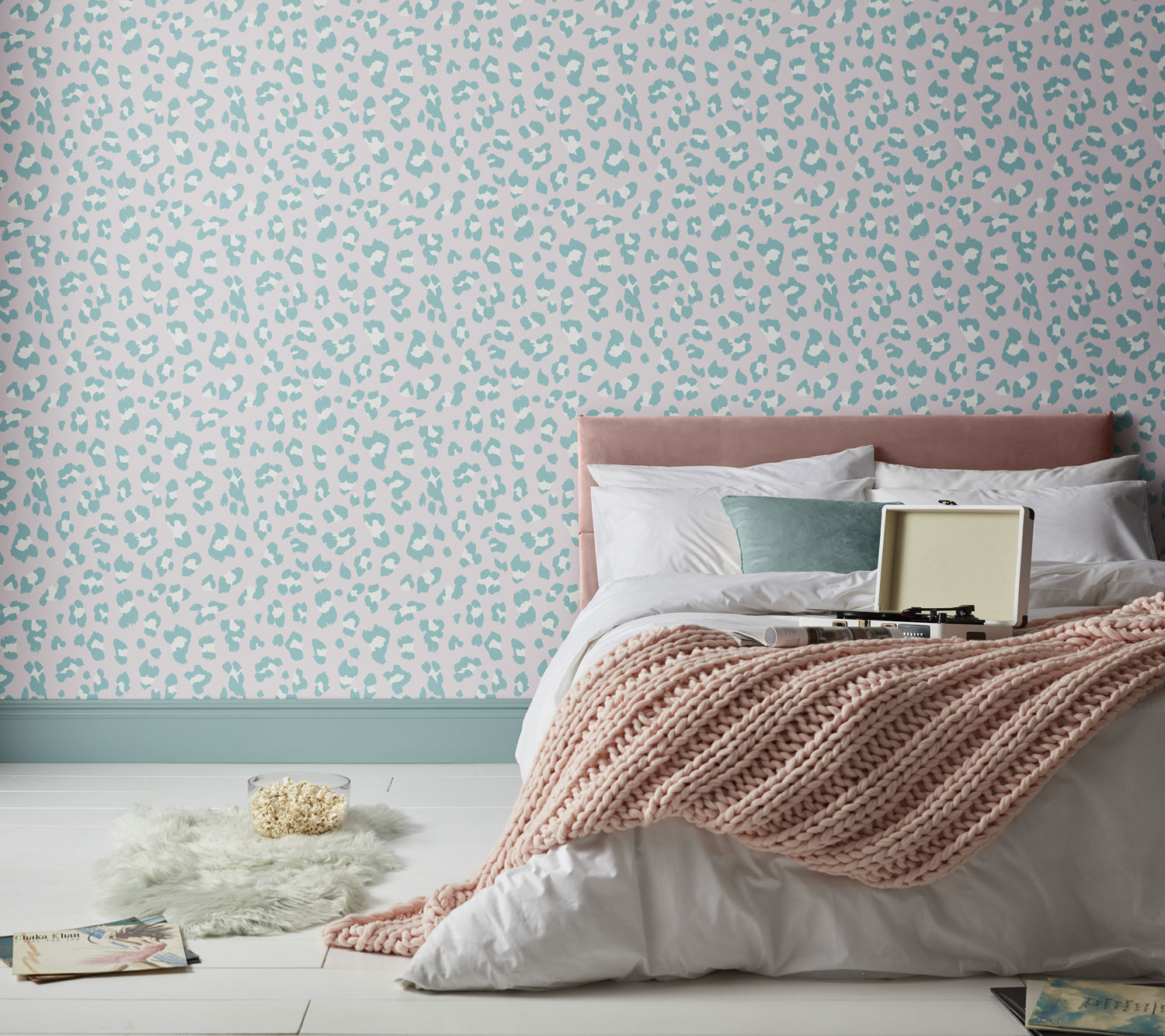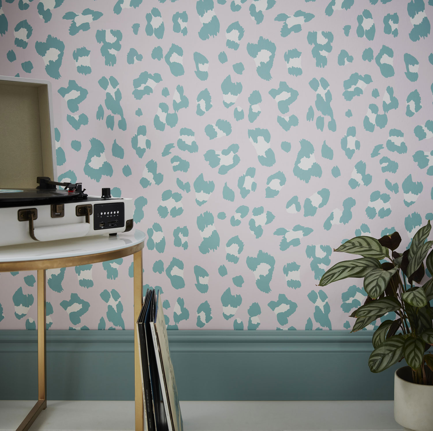 Glatte rosa Vliestapete, Leopardenfellmotiv in unkonventionellen Farben.