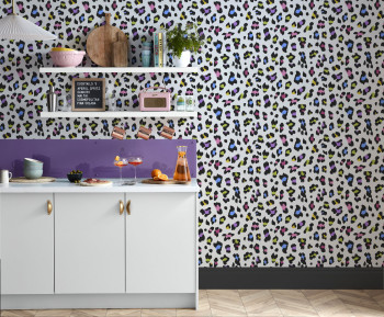 Glatte weiße Vliestapete, Leopardenfellmotiv in unkonventionellen Farben.