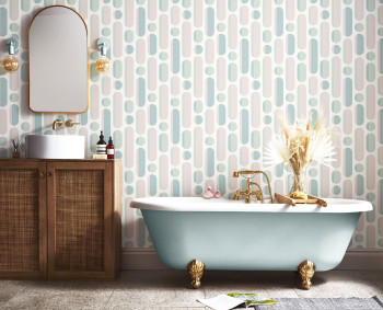 Weiße glatte Vlies-Retro-Tapete, geometrisches Muster in Grün- und Rosatönen.