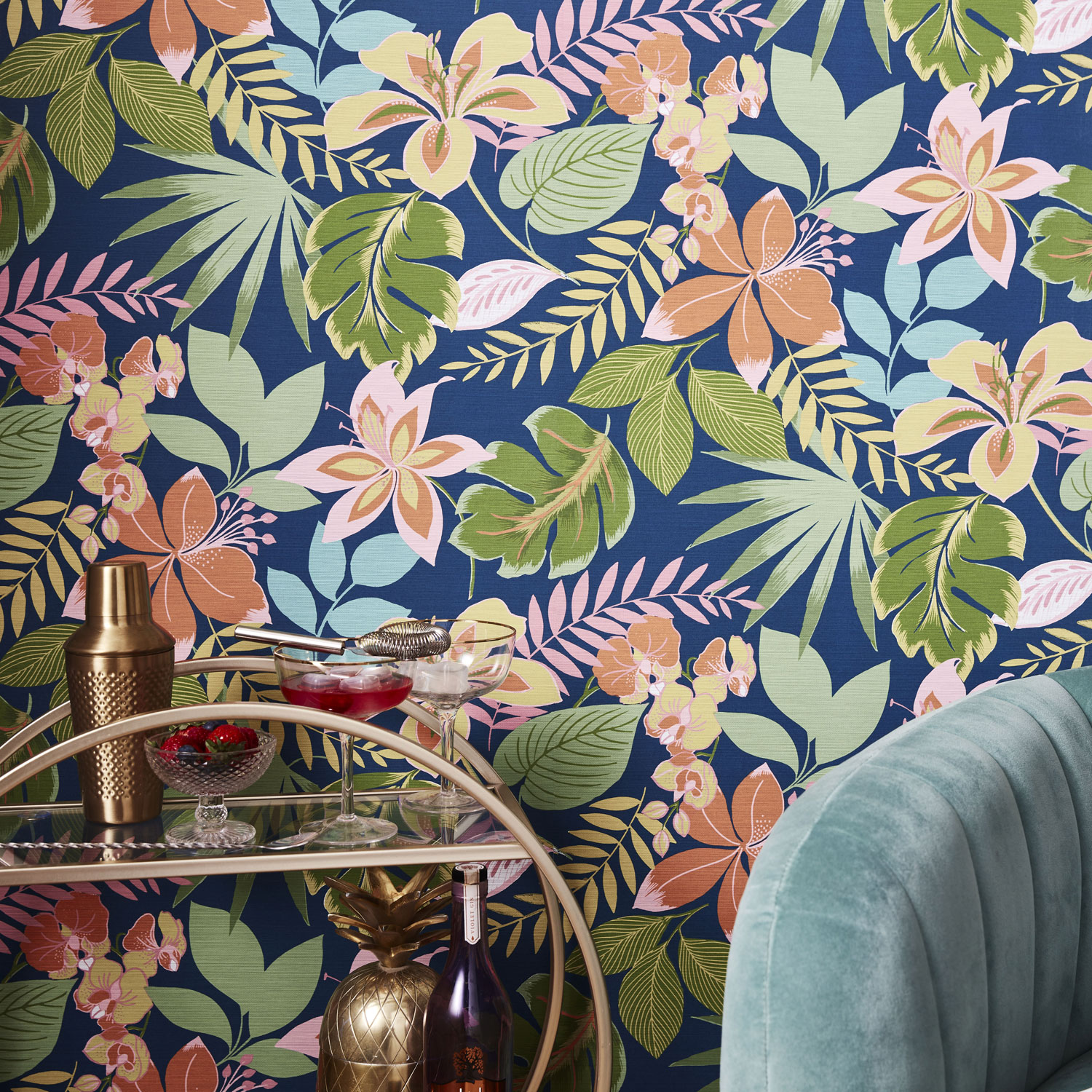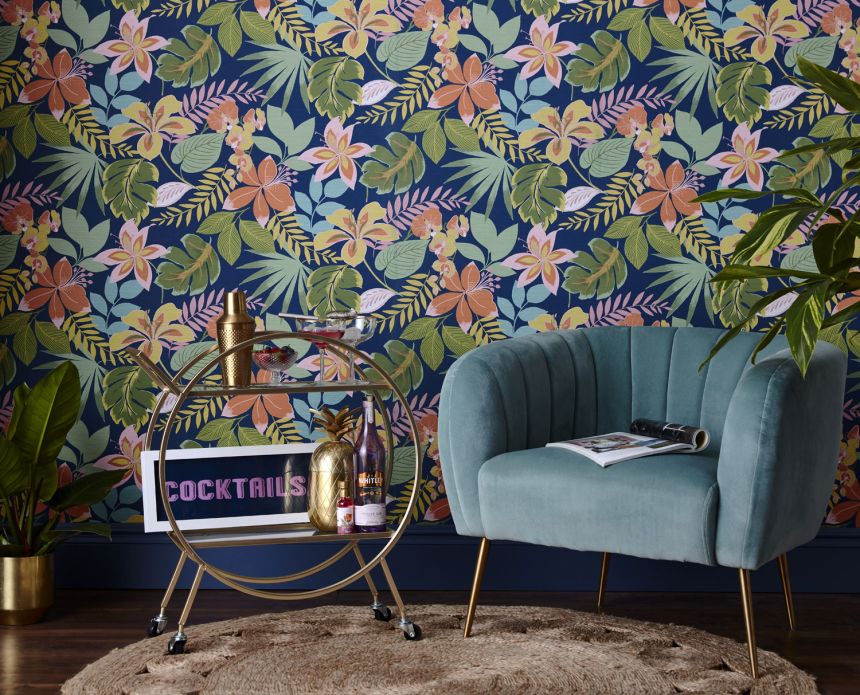In der Tapetenkollektion finden Sie Tapeten mit dem Motiv bunte Blumen mit tropischen Blättern, exotische Blumen mit Papageien und Schmetterlingen, aber auch geometrische Retromuster in interessanten Pastellfarben.