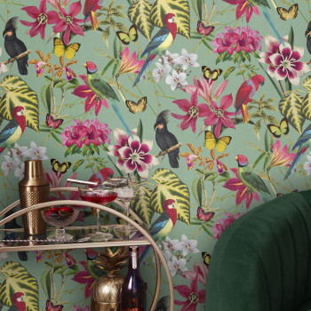 Glatte grüne Vliestapete, Stoffimitattextur, Blumen, Papageien und Schmetterlinge in Grün-, Rosa- und Gelbtönen.