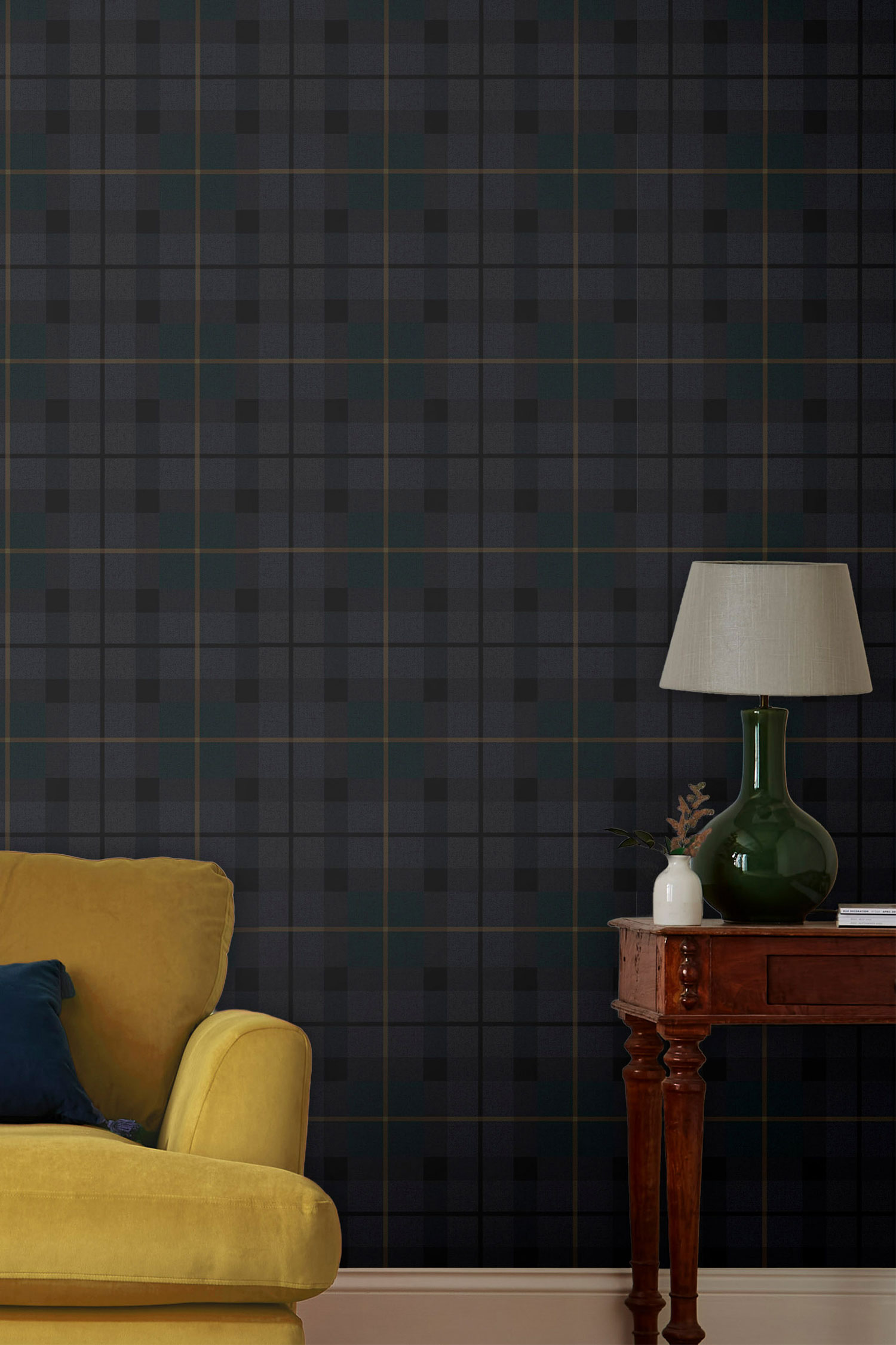 Glatte blau-grüne Vliestapete, Schottenstoff-Imitat.