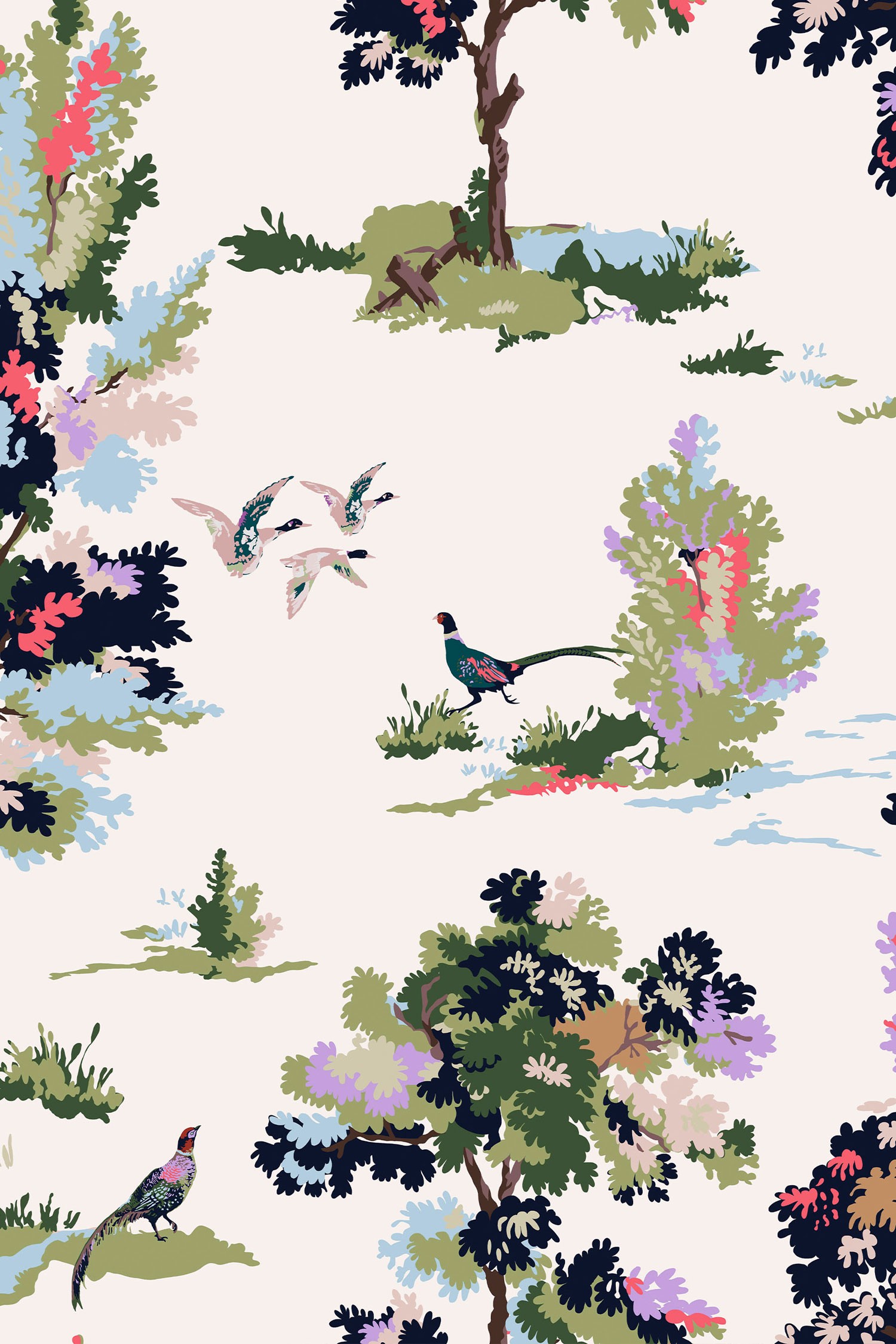 Cremefarbene Vliestapete, Motiv aus Wald, Bäumen, Wildenten und Fasanen.