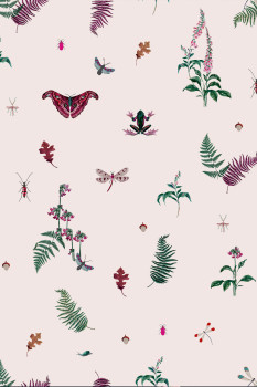 Cremefarbene Vliestapete, Motive aus Farnblättern, Blumen und Tieren.