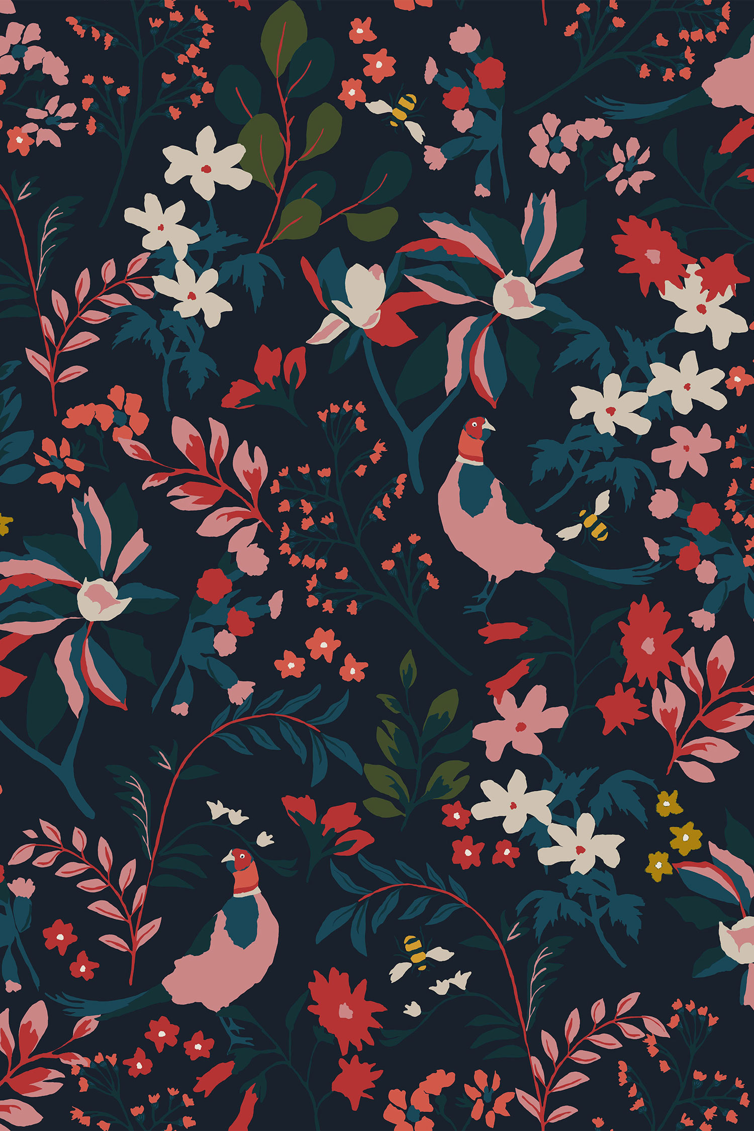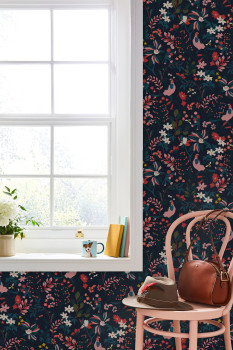 Dunkelblaue Vliestapete, Motiv aus Blumen, Blättern, Zweigen und Fasanen.