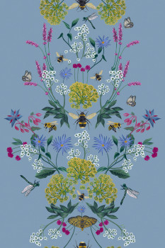 Blaue Vliestapete, Motive von Wiesenblumen, Schmetterlingen, Libellen und Bienen.