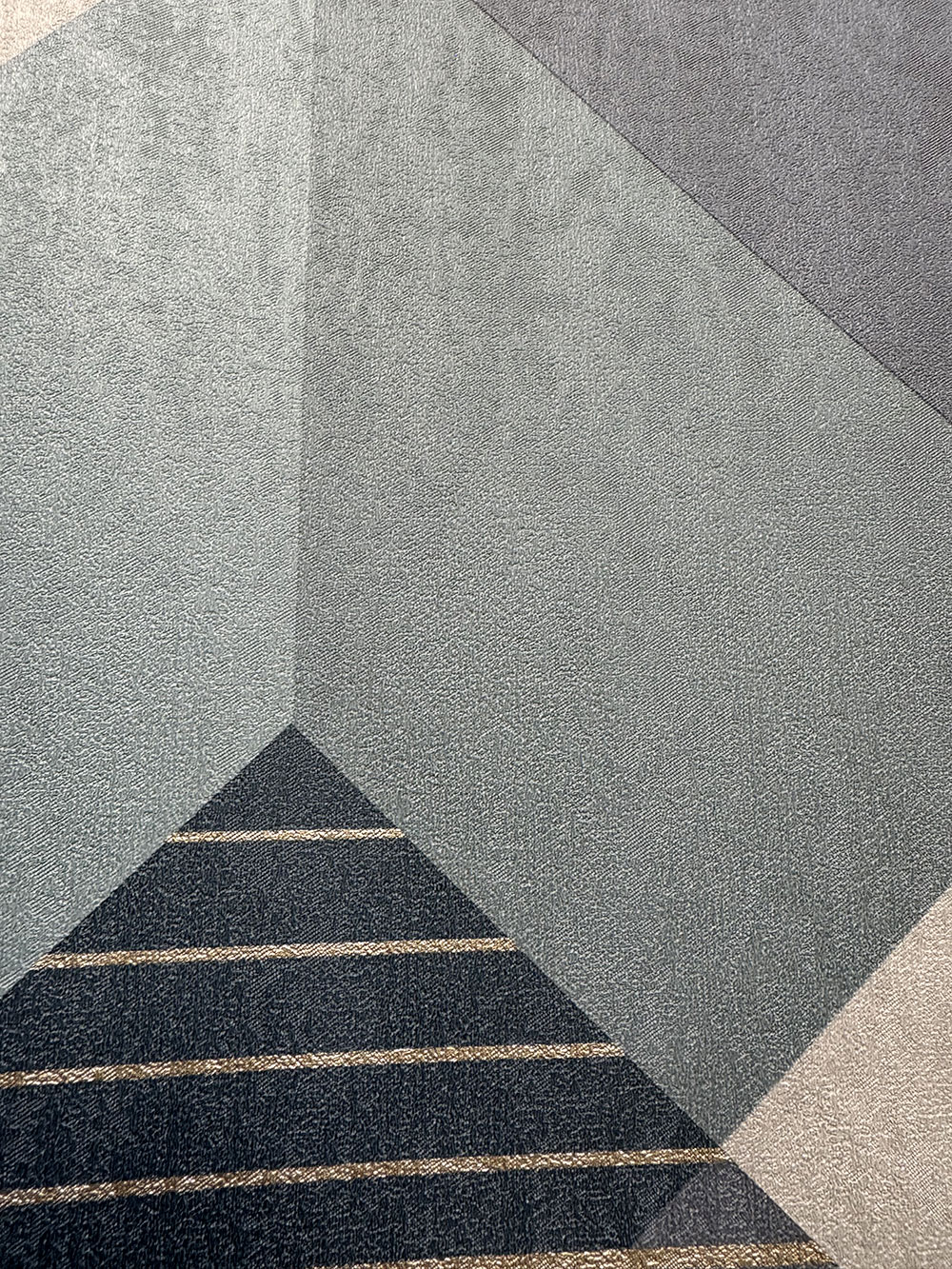 Vliestapete, geometrisches Muster in Blau- und Grautönen, Linien in hellgoldener Farbe.