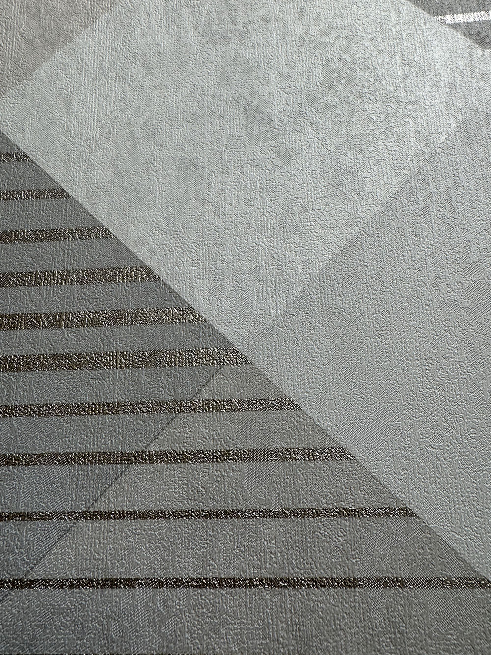 Vliestapete, geometrisches Muster in Grau-Beige-Tönen, Linien in hellgoldener Farbe.