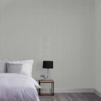 Strukturierte, salbeigrüne Vliestapete mit winzigen silbernen Flittern, gestreifte Textur.