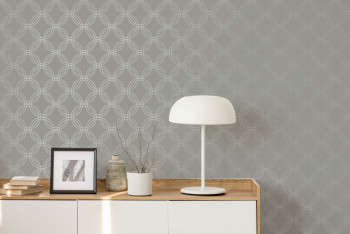 Glatte graue Vliestapete mit silbernem geometrischem Muster.