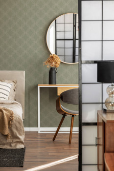Glatte salbeigrüne Vliestapete mit goldenem geometrischem Muster.