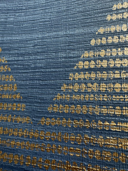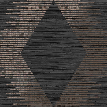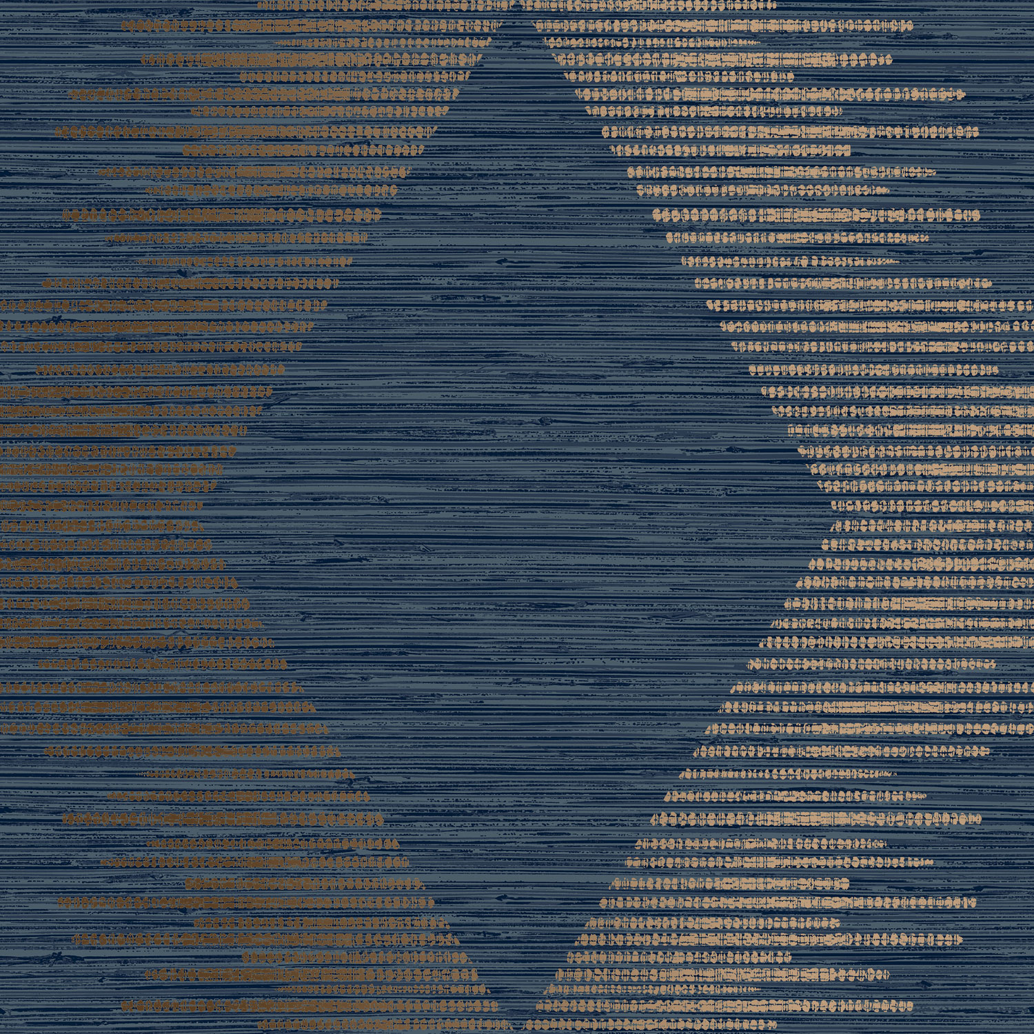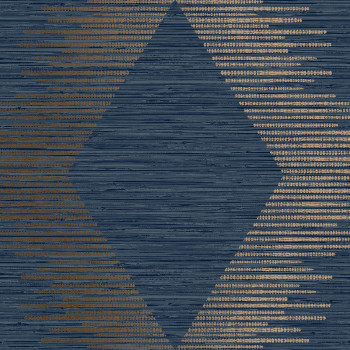 Dunkelblaue Vliestapete, geometrisches Muster, kupferfarbene Linien bilden Rauten.