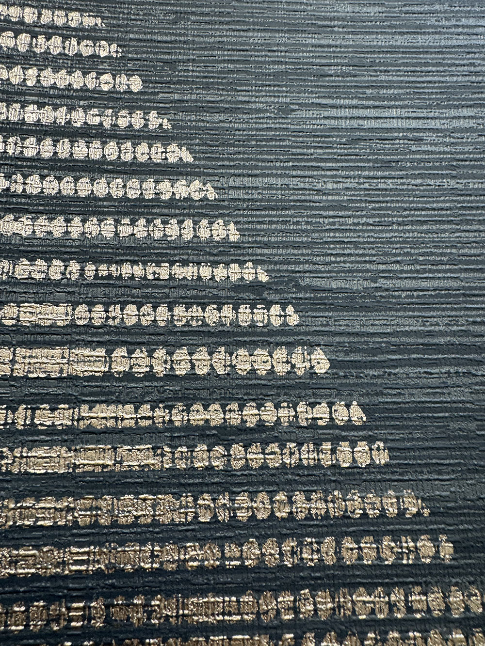 Geprägte, schwarze Vliestapete, geometrisches Muster, Linien in der Farbe Roségold bilden Rauten.