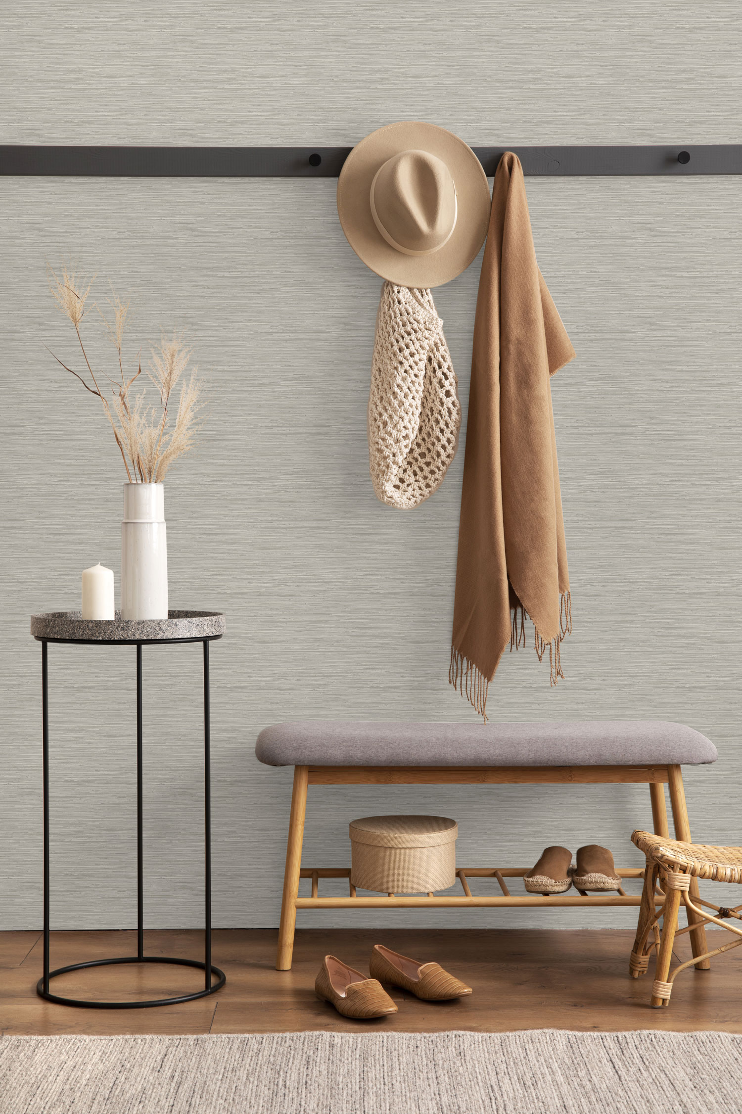 Strukturierte Vliestapete, Grau-Beige-Töne.