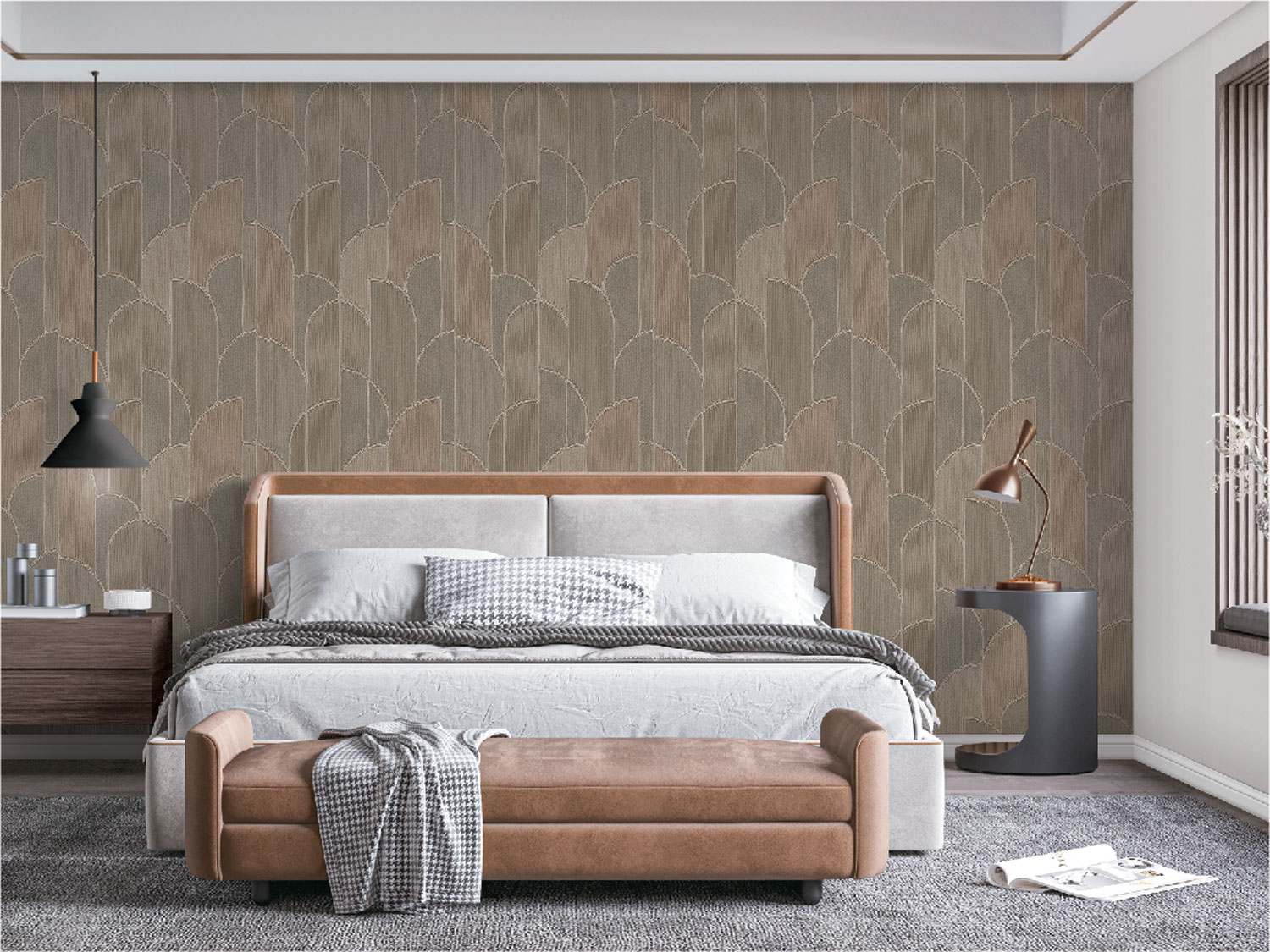 Tapeten mit geometrischen Mustern werden durch farbig gestaltete Marmormuster ergänzt, um eine warme und angenehme Atmosphäre in Ihrem Zuhause zu schaffen. Das Endergebnis ist luxuriös und elegant und passt zu einer Vielzahl von Einrichtungsstilen.