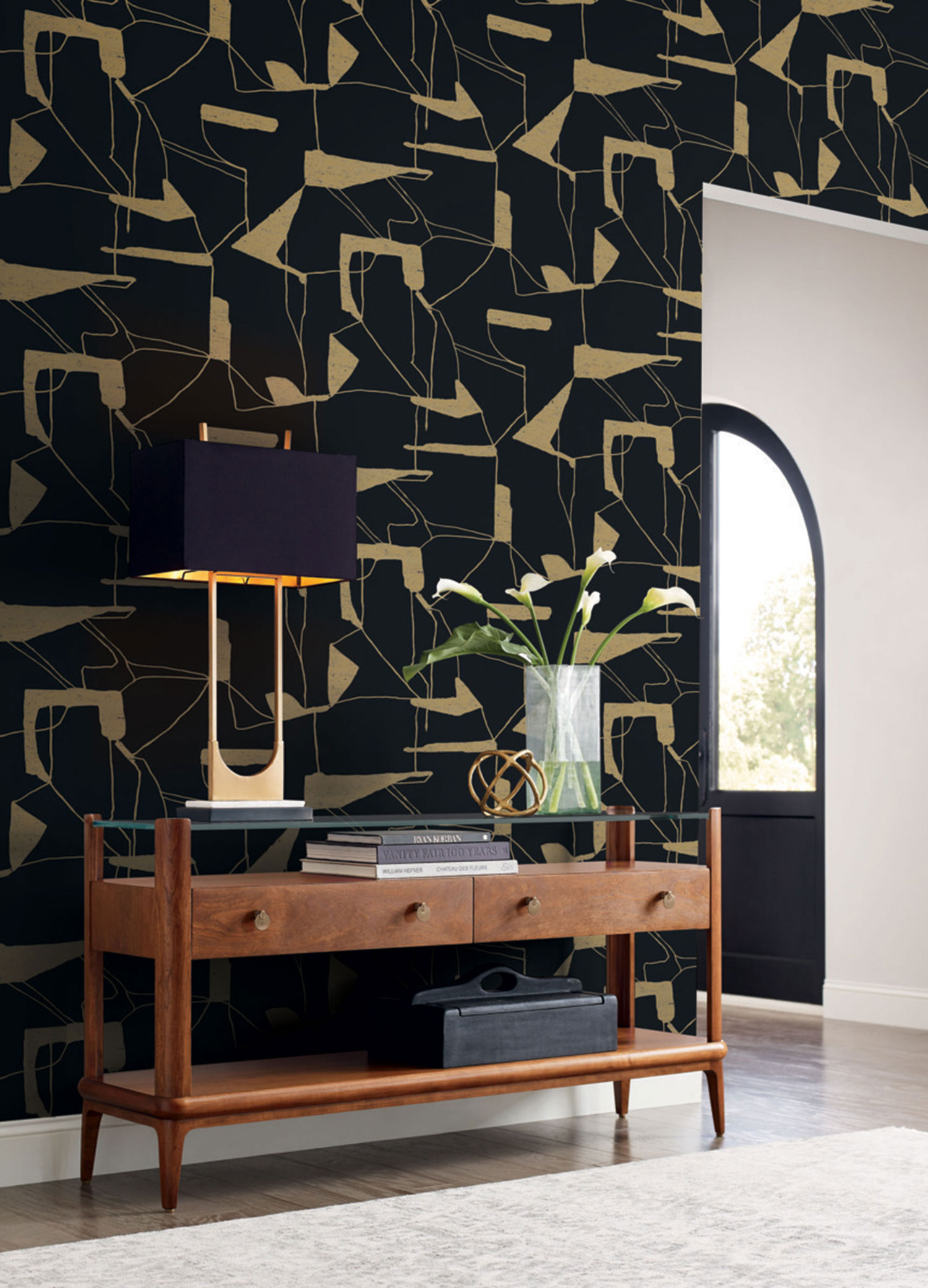 Matte, glatte, schwarze Vliestapete mit goldenem, geprägtem geometrischem Muster.