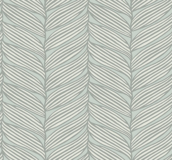 Vliestapete, hellgrau-blauer Hintergrund, cremeweiße Blätter mit geprägten, silbernen Umrissen.
