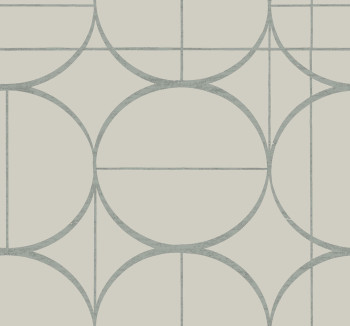 Grau-beige/taupe, glatte Vliestapete, geprägte silberne Linien und Kreise.