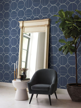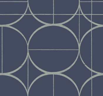 Blaue, glatte Vliestapete, geprägte silberne Linien und Kreise.