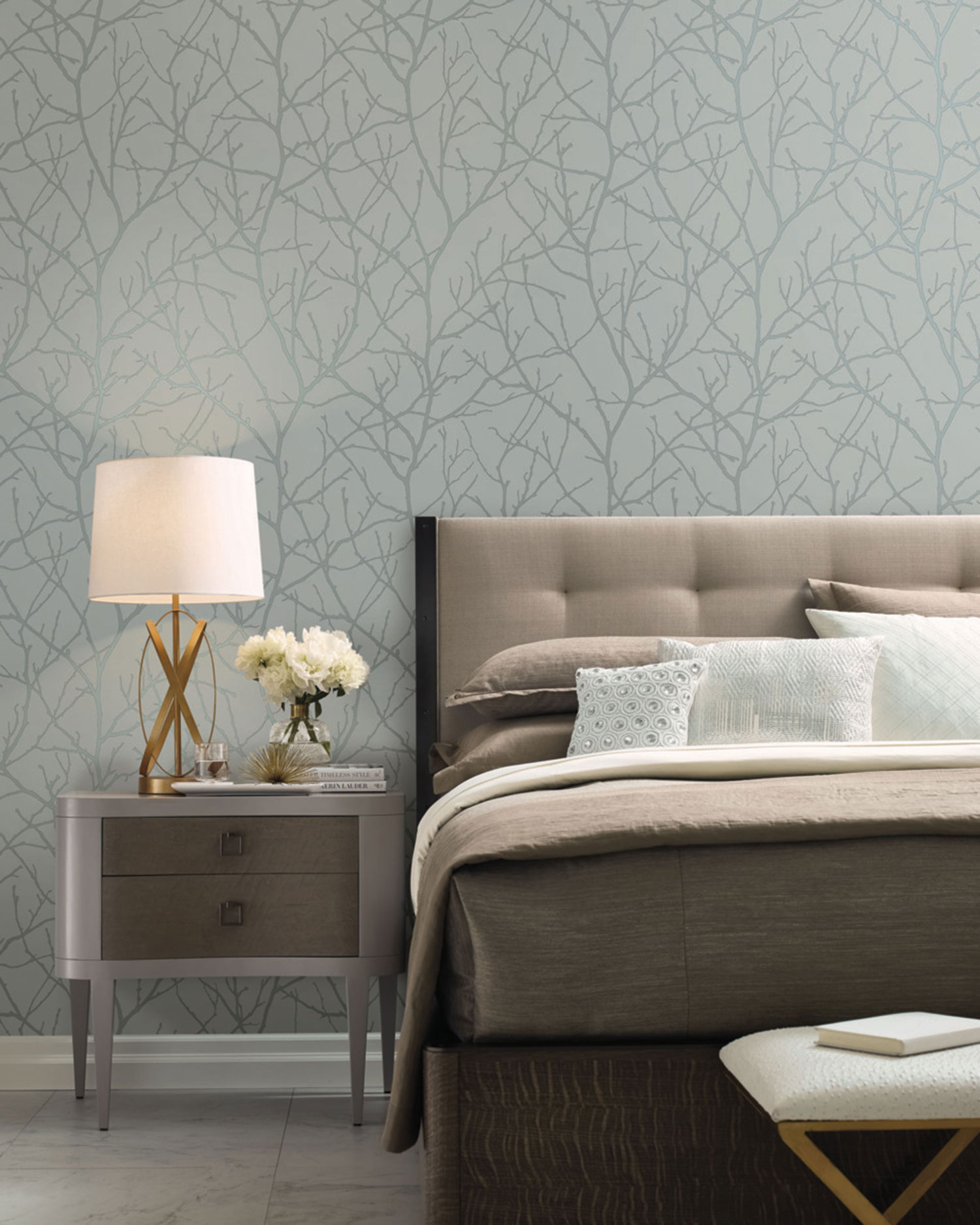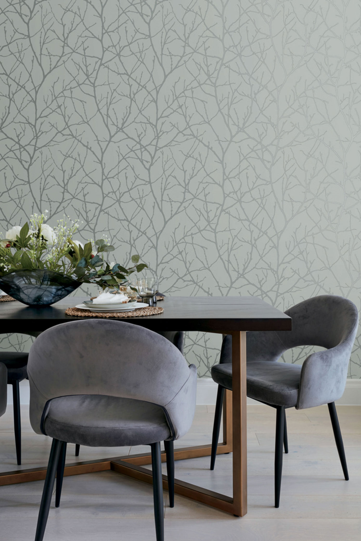 Blaugraue Vliesltapete, glatter Hintergrund, geprägte silberne Baumzweige.