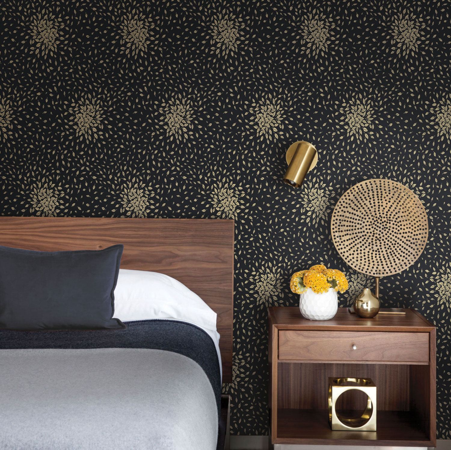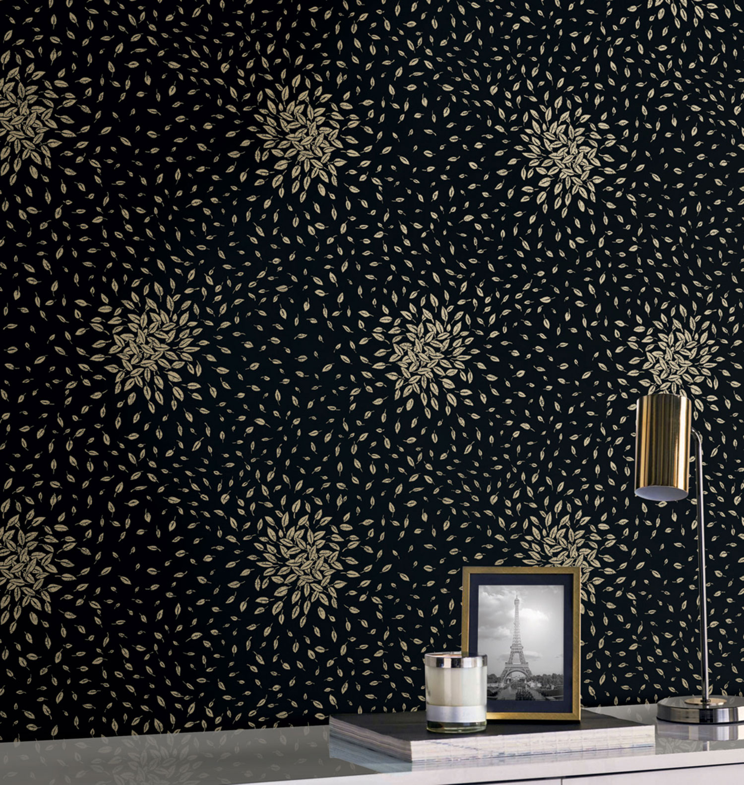 Schwarze Vliesltapete, glatter Hintergrund, geprägte goldene Blätter.
