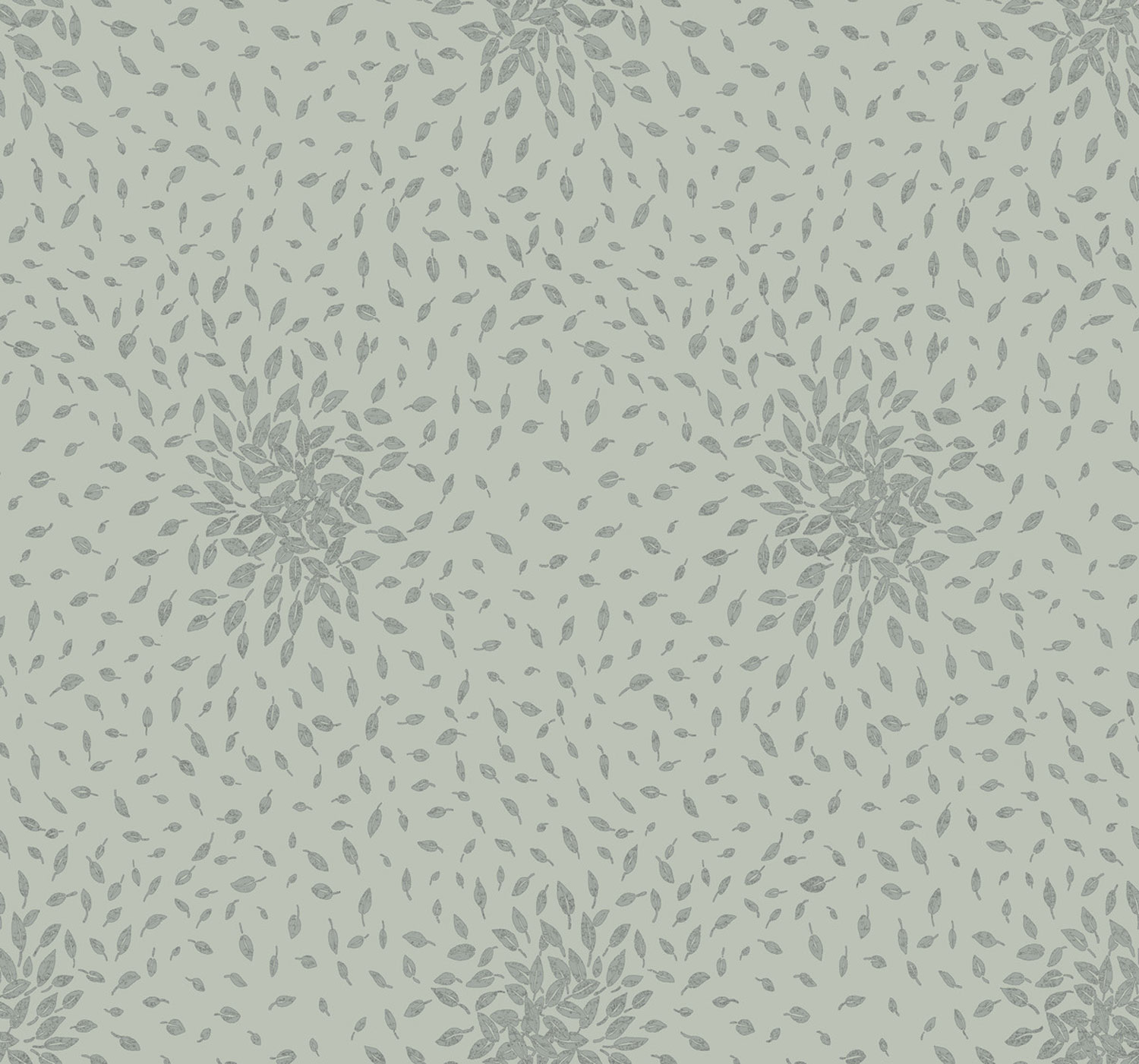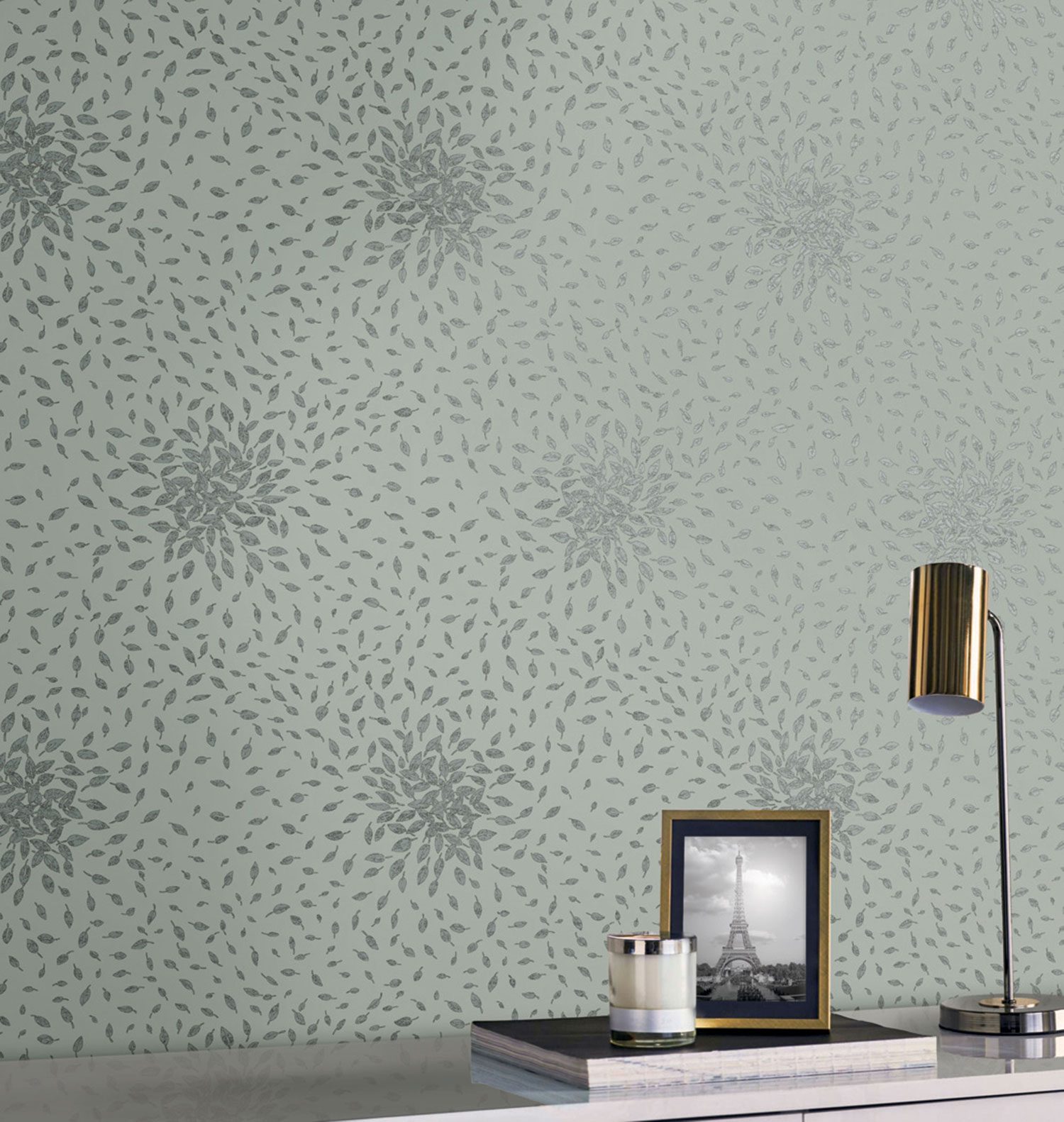 Hellgrüne Vliesltapete, glatter Hintergrund, geprägte silberne Blätter.