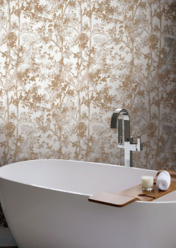 Weiße Vliestapete, geprägtes Blumenmuster in Metallic-Gold, grau-beige Konturen.