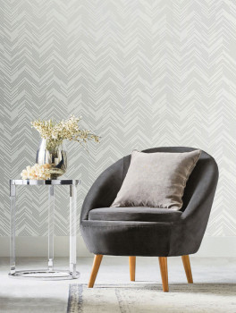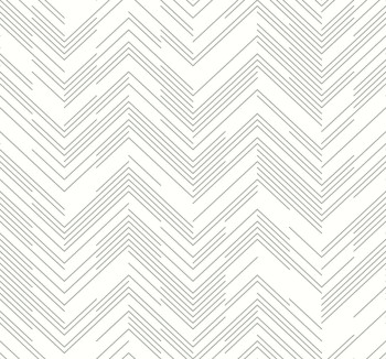 Weiße Vliestapete mit silbernem, geprägtem Zickzack-Muster.