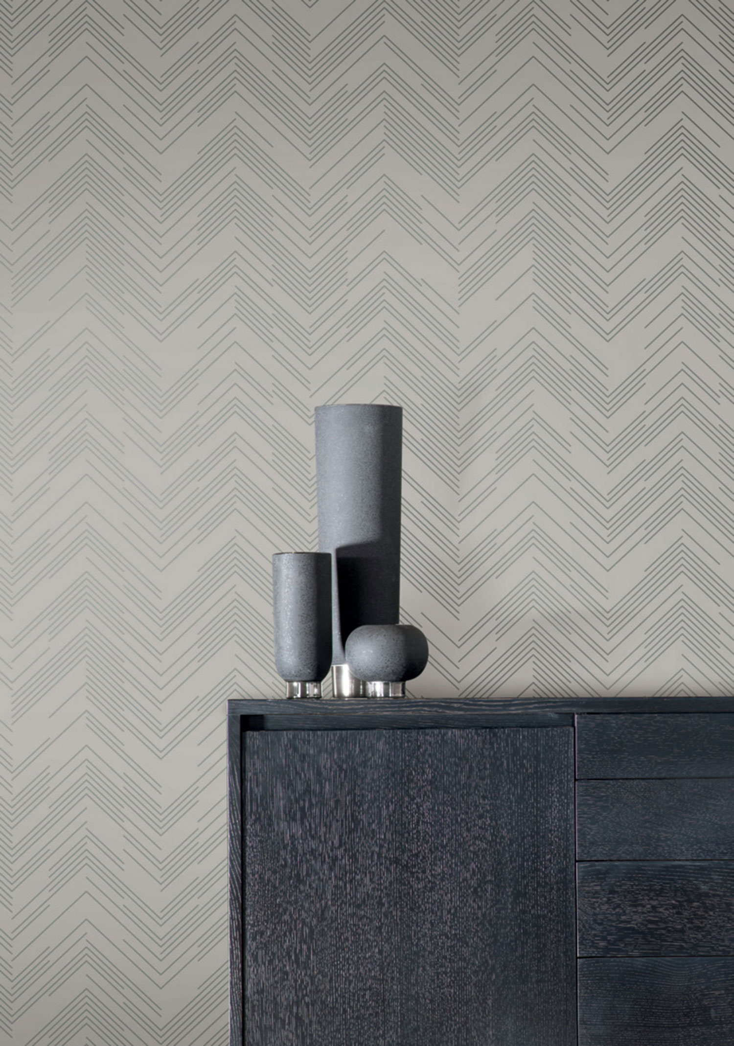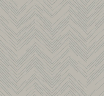 Grau-beige/taupefarbene Vliestapete mit silbernem, geprägtem Zickzack-Muster.