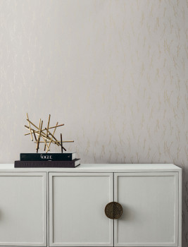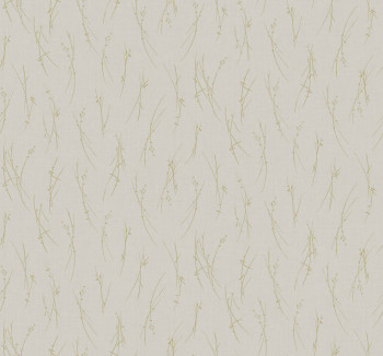Graue Vliestapete, die an eine Stofftextur erinnert, goldenes, geprägtes, elegantes Muster, das an Zweige erinnert.
