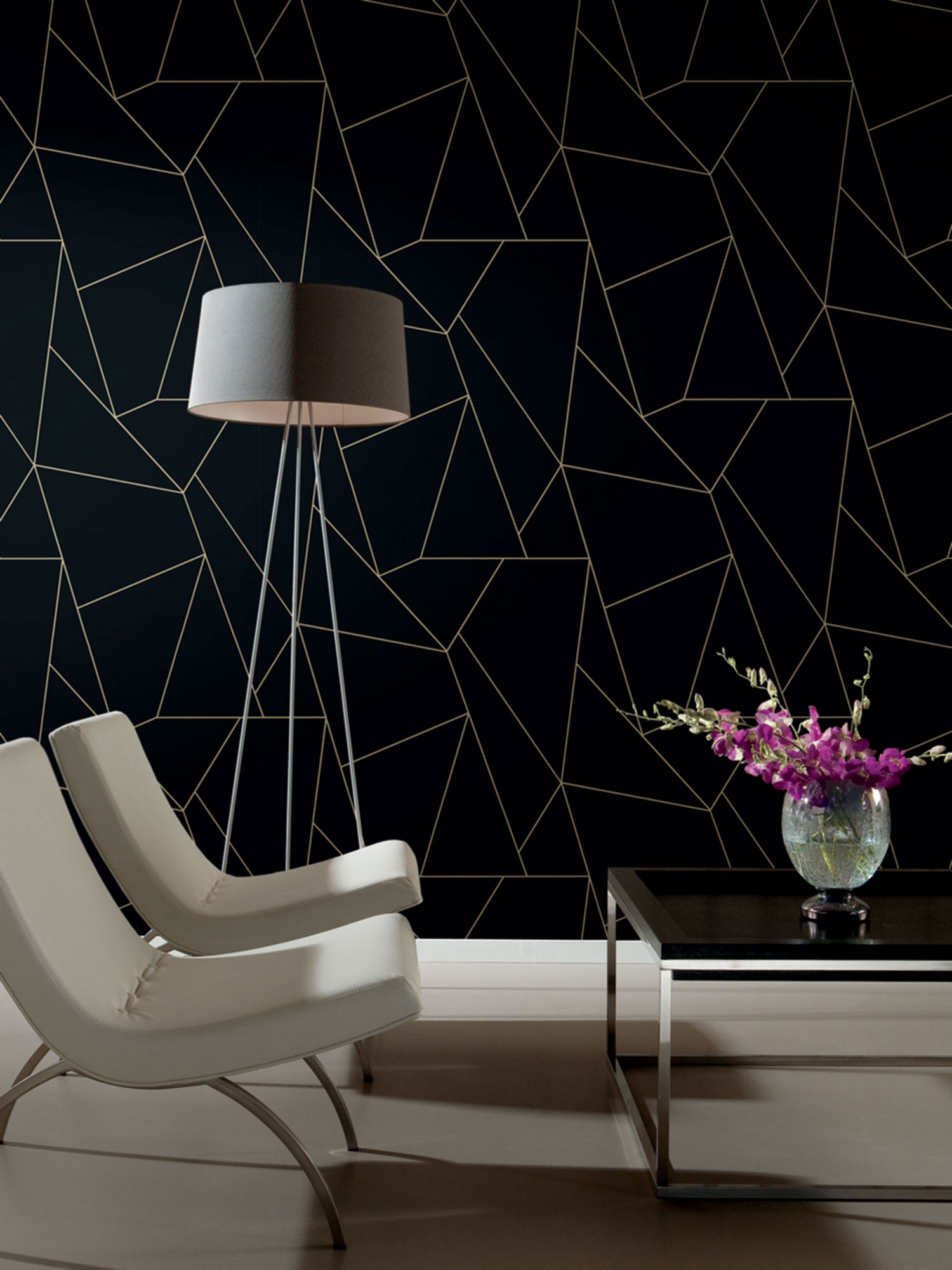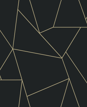 Schwarze Vliestapete, geprägte, goldene Linien bilden geometrische Muster.