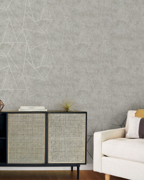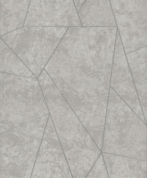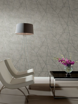 Grau marmorierte Vliestapete, geprägte, silberne Linien bilden geometrische Muster.