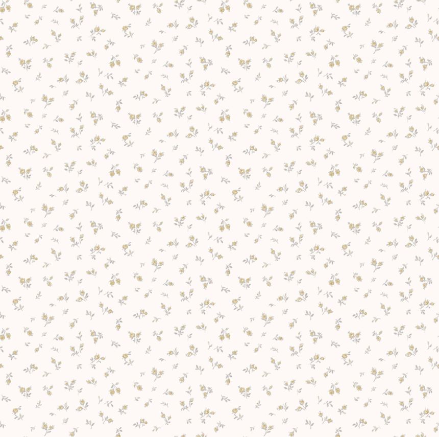 Matte, weiße Vliestapete mit einem Muster aus grauen, hellblauen und beigen Blumen mit Blättern und Zweigen. Das Innenfoto dient nur zur Veranschaulichung – verschiedene Farben.