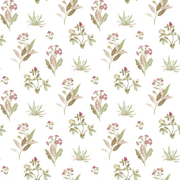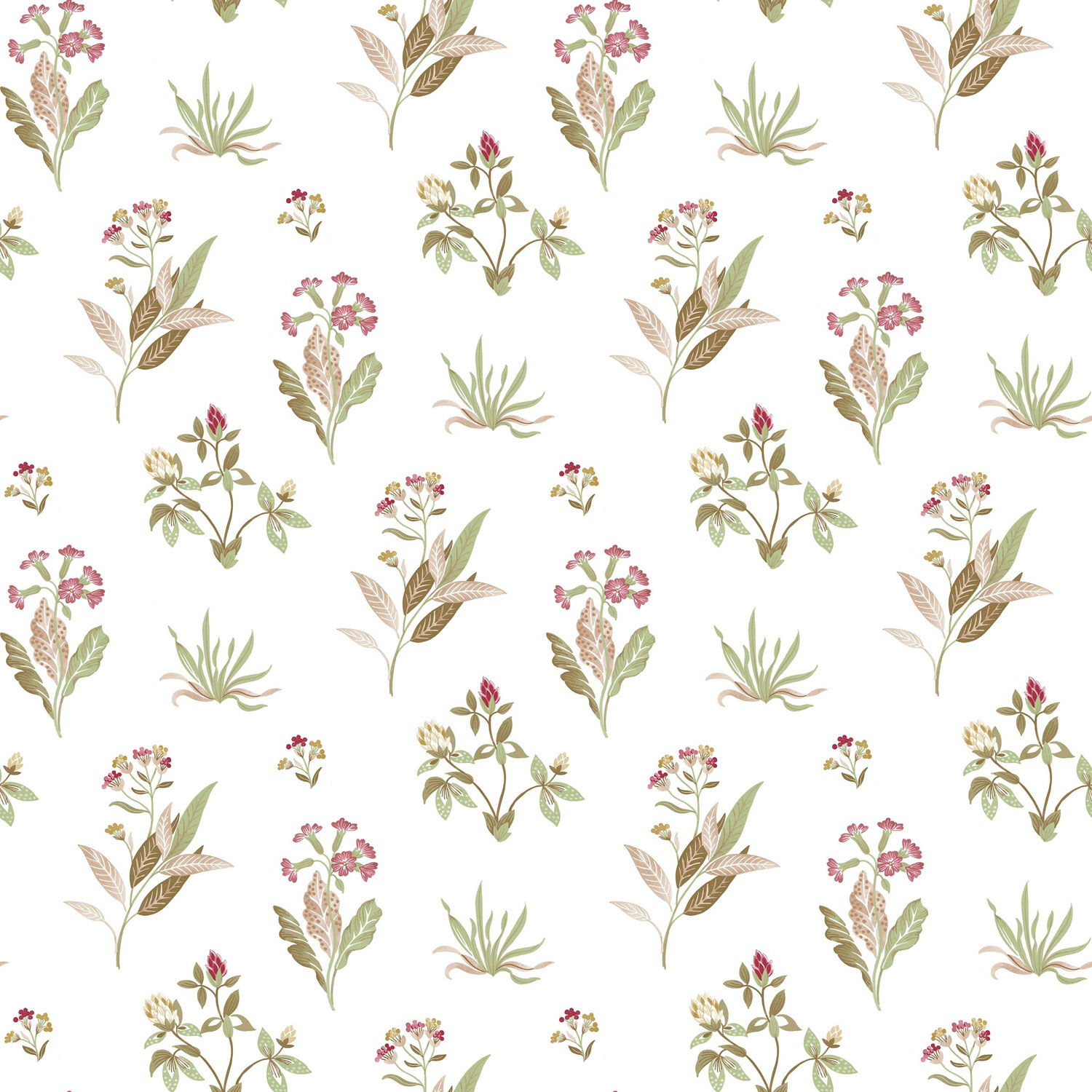 Matte, weiße Vliestapete mit einem Muster aus bordeauxroten, beigen und grünen Blumen mit Blättern und Zweigen. Innenfoto dient nur zur Veranschaulichung - verschiedene Farben.