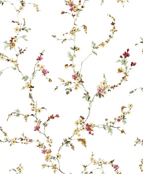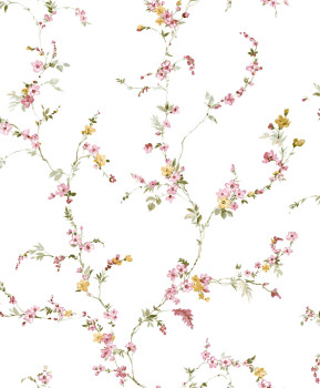 Matte, weiße Vliestapete mit floralem Muster mit Blättern in Rosa, Gelb und Grün. Innenfoto dient nur zur Veranschaulichung - verschiedene Farben.