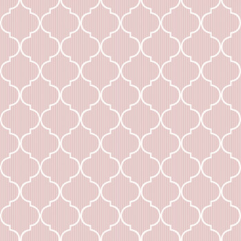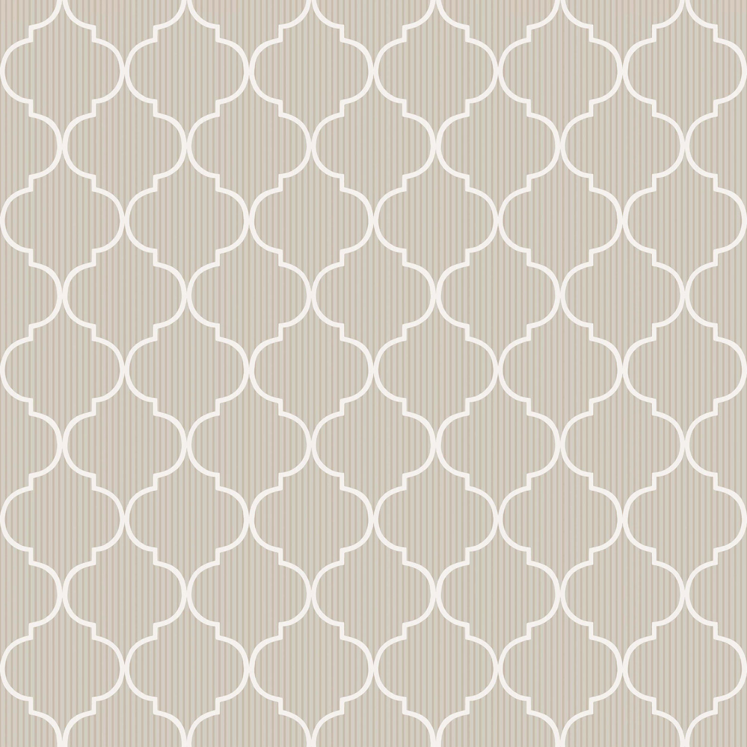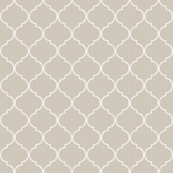 Matte, beige Vliestapete mit geometrischem Ornamentmuster in Weiß auf gestreiftem Hintergrund.