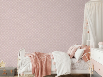 Matte, rosa Vliestapete mit geometrischem Ornamentmuster in Weiß auf gestreiftem Hintergrund.