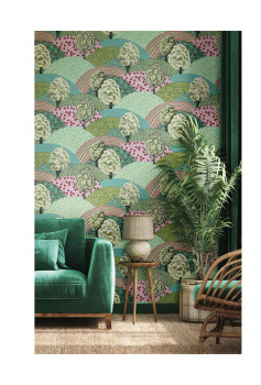 Matte, grüne Vliestapete mit einem Motiv aus Bäumen und Hügeln mit Blumen und Blättern in Grün, Weiß und Rosa. Das Foto des Innenraums dient nur zur Veranschaulichung – verschiedene Farben.